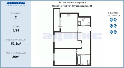 О квартире: Функциональная планировка общей площадью 52,8 кв.м. включает две уютные комнаты (12,4 и 14 кв.м.) и кухню 10,6 кв.м. Квартира расположена на 6 этаже 24-этажного дома, что обеспечивает прекрасный вид и комфорт.