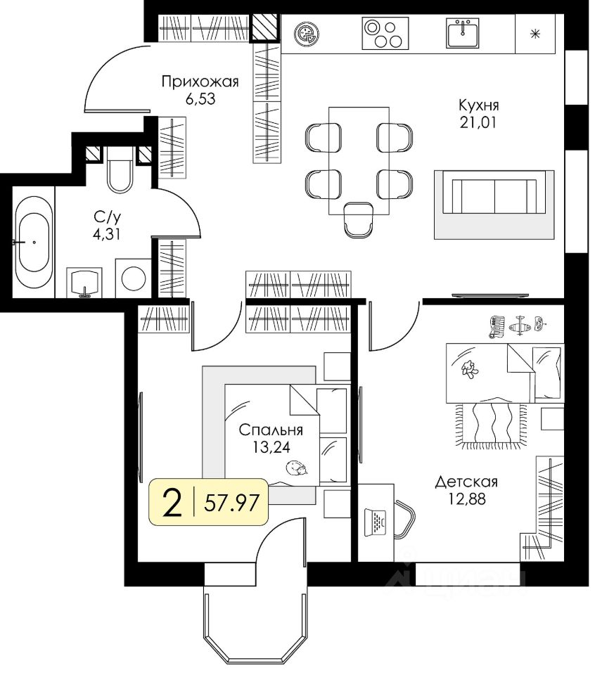 Продаётся 2-комнатная квартира в строящемся доме (Этап 1. подэтап 1.1), срок сдачи: IV-кв. 2027, общей площадью 57.97 кв.м., на 4 этаже. Новый жилой комплекс "Всевгород" от застройщика "Консоль" расположен по адресу: Ленинградская область, Всеволожский район, посёлок Романовка