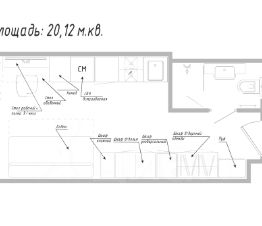 Планировка: функциональная студия 20,1 м²: кухня, санузел, жилая зона.