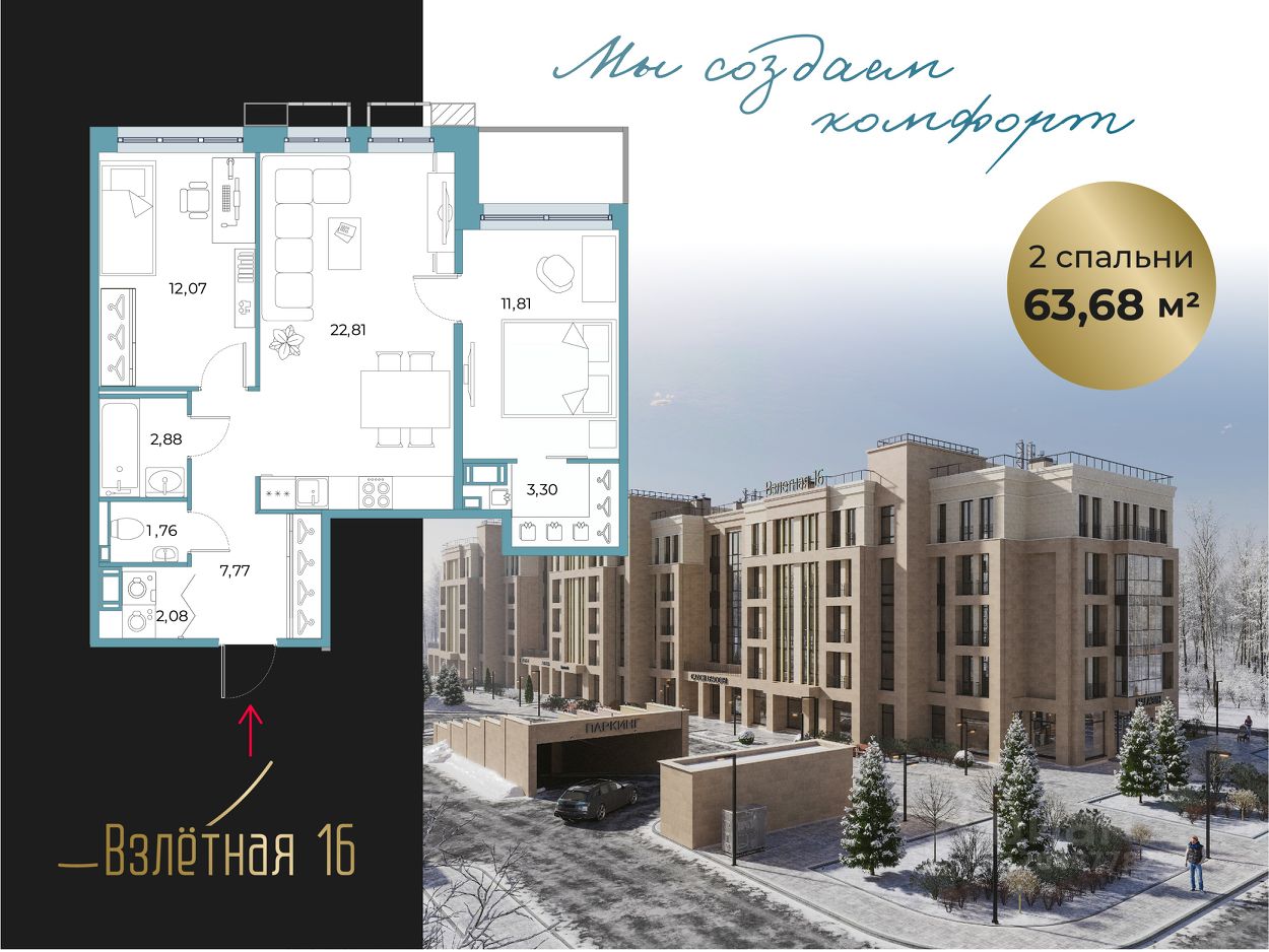 Новый ЖК "Взлетная 16", камерный малоэтажный дом на 68 квартир. Дом состоит из трех 5-этажных секций. Комплекс является уникальным за счет небольшого количества квартир с большим выбором продуманных планировочных решений.