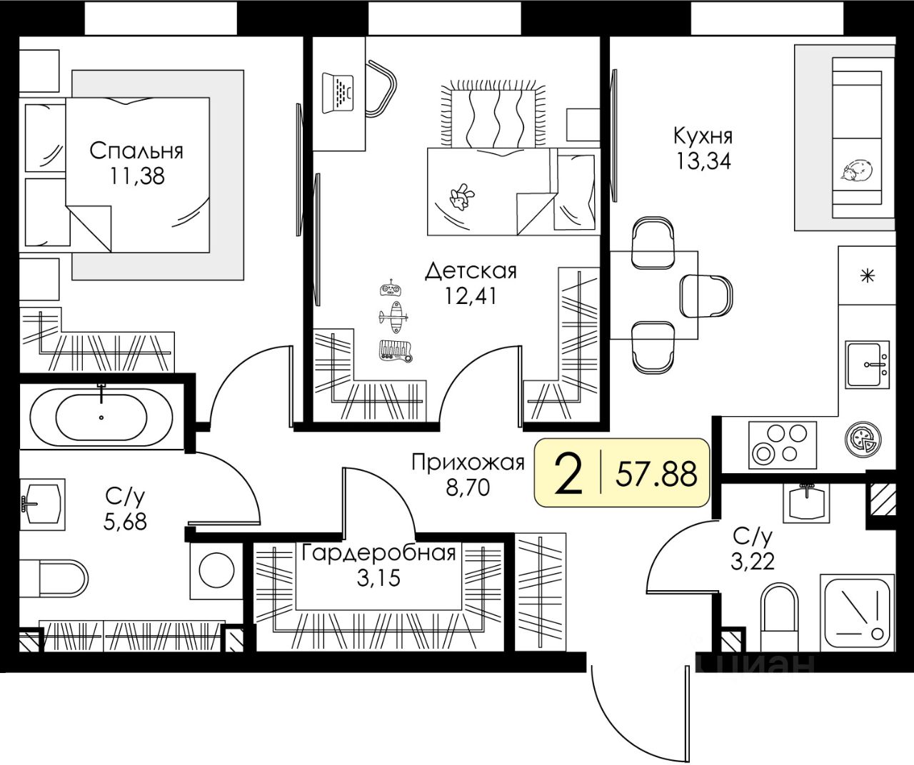 Продаётся 2-комнатная квартира в строящемся доме (Этап 1. подэтап 1.1), срок сдачи: IV-кв. 2027, общей площадью 57.88 кв.м., на 2 этаже. Новый жилой комплекс "Всевгород" от застройщика "Консоль" расположен по адресу: Ленинградская область, Всеволожский район, посёлок Романовка