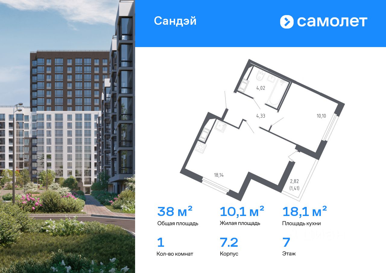 Строим кварталы для жизни с заботой о будущем. Предлагается 1-комнатная квартира комфорт-класса 38 кв.м в корпусе 7.2 на 7 этаже, в ЖК "Сандэй"