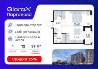 Продается 1-комн. квартира на 12-м этаже в проекте комфорт-класса GloraX Парголово. Общая площадь лота составляет 37,06 кв. м, из которых 14,28 кв. м отведено под жилую и 11,25 кв. м под кухонную зону. Номер квартиры - 110.