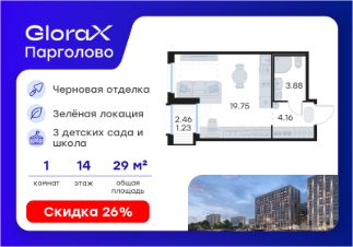 Продается квартира-студия на 14-м этаже в проекте комфорт-класса GloraX Парголово. Общая площадь лота составляет 29,02 кв. м, из которых 19,75 кв. м отведено под жилую и кв. м под кухонную зону. Номер квартиры - 127.