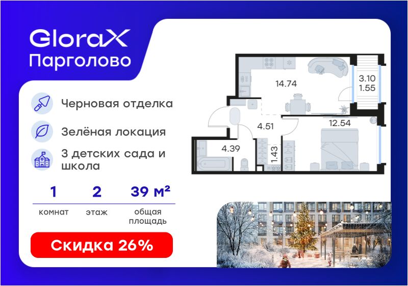 Продается 1-комн. квартира на 2-м этаже в проекте комфорт-класса GloraX Парголово. Общая площадь лота составляет 39,16 кв. м, из которых 12,54 кв. м отведено под жилую и 14,74 кв. м под кухонную зону. Номер квартиры - 2.