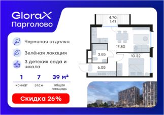 Продается 1-комн. квартира на 7-м этаже в проекте комфорт-класса GloraX Парголово. Общая площадь лота составляет 39,93 кв. м, из которых 10,32 кв. м отведено под жилую и 17,80 кв. м под кухонную зону. Номер квартиры - 59.