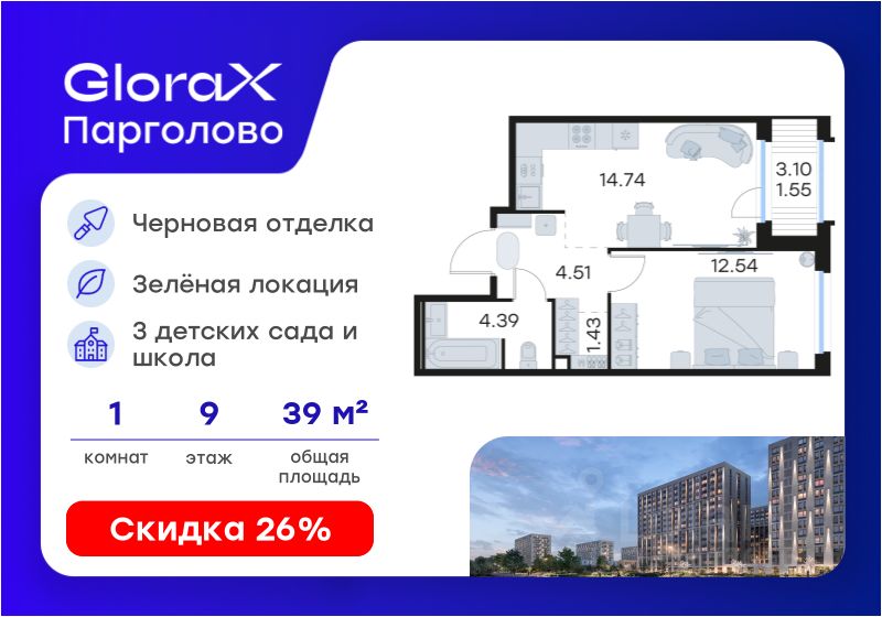 Продается 1-комн. квартира на 9-м этаже в проекте комфорт-класса GloraX Парголово. Общая площадь лота составляет 39,16 кв. м, из которых 12,54 кв. м отведено под жилую и 14,74 кв. м под кухонную зону. Номер квартиры - 72.