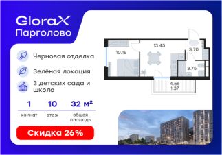 Продается 1-комн. квартира на 10-м этаже в проекте комфорт-класса GloraX Парголово. Общая площадь лота составляет 32,42 кв. м, из которых 10,15 кв. м отведено под жилую и 13,45 кв. м под кухонную зону. Номер квартиры - 223.