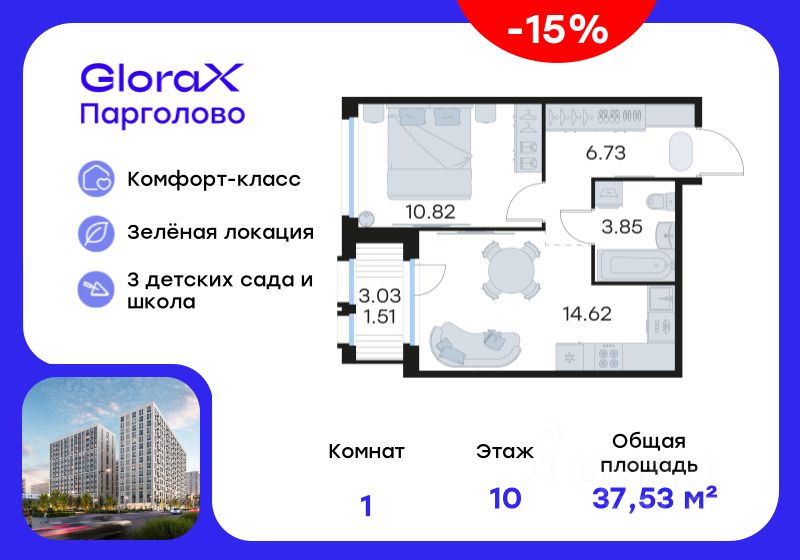 Продается 1-комн. квартира на 10-м этаже в проекте комфорт-класса GloraX Парголово. Общая площадь лота составляет 37,53 кв. м, из которых 10,82 кв. м отведено под жилую и 14,62 кв. м под кухонную зону. Номер квартиры - 225.