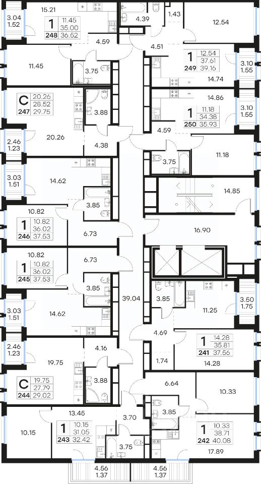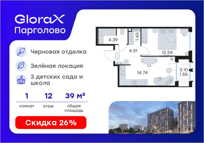 Продается 1-комн. квартира на 12-м этаже в проекте комфорт-класса GloraX Парголово. Общая площадь лота составляет 39,16 кв. м, из которых 12,54 кв. м отведено под жилую и 14,74 кв. м под кухонную зону. Номер квартиры - 249.