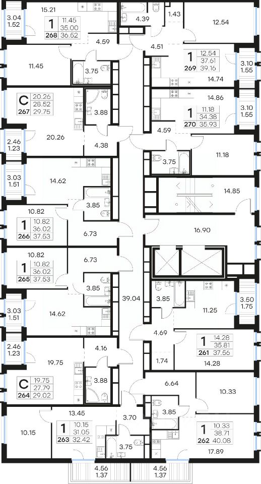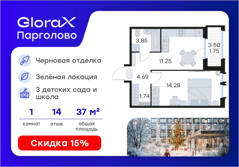 Продается 1-комн. квартира на 14-м этаже в проекте комфорт-класса GloraX Парголово. Общая площадь лота составляет 37,56 кв. м, из которых 14,28 кв. м отведено под жилую и 11,25 кв. м под кухонную зону. Номер квартиры - 261.