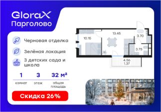 Продается 1-комн. квартира на 3-м этаже в проекте комфорт-класса GloraX Парголово. Общая площадь лота составляет 32,42 кв. м, из которых 10,15 кв. м отведено под жилую и 13,45 кв. м под кухонную зону. Номер квартиры - 153.