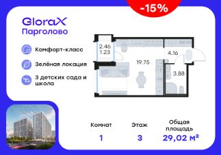 Продается квартира-студия на 3-м этаже в проекте комфорт-класса GloraX Парголово. Общая площадь лота составляет 29,02 кв. м, из которых 19,75 кв. м отведено под жилую и кв. м под кухонную зону. Номер квартиры - 154.