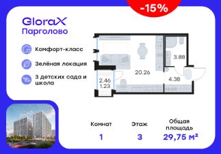 Продается квартира-студия на 3-м этаже в проекте комфорт-класса GloraX Парголово. Общая площадь лота составляет 29,75 кв. м, из которых 20,26 кв. м отведено под жилую и кв. м под кухонную зону. Номер квартиры - 157.