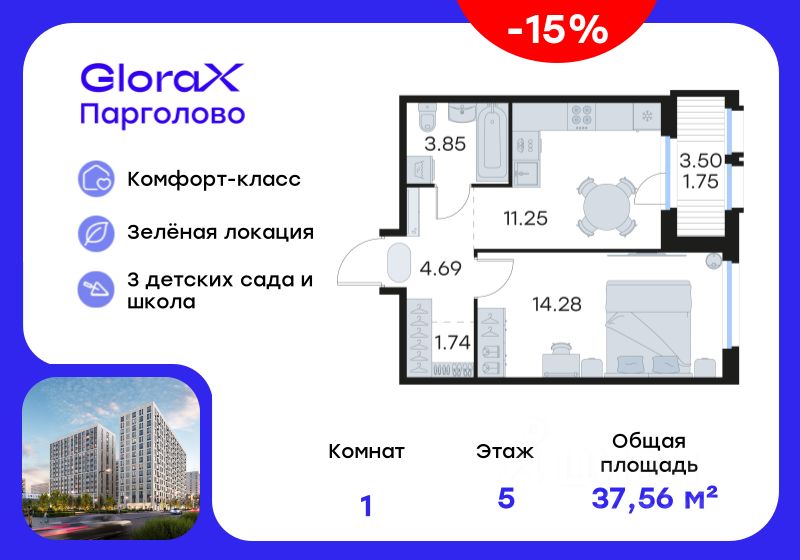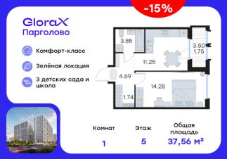Продается 1-комн. квартира на 5-м этаже в проекте комфорт-класса GloraX Парголово. Общая площадь лота составляет 37,56 кв. м, из которых 14,28 кв. м отведено под жилую и 11,25 кв. м под кухонную зону. Номер квартиры - 171.
