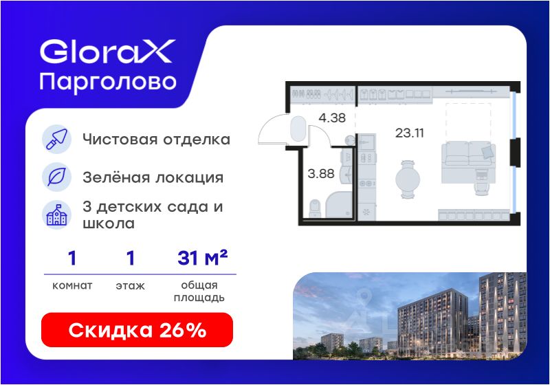 Продается квартира-студия на 1-м этаже в проекте комфорт-класса GloraX Парголово. Общая площадь лота составляет 31,37 кв. м, из которых 23,11 кв. м отведено под жилую и кв. м под кухонную зону. Номер квартиры - 4.