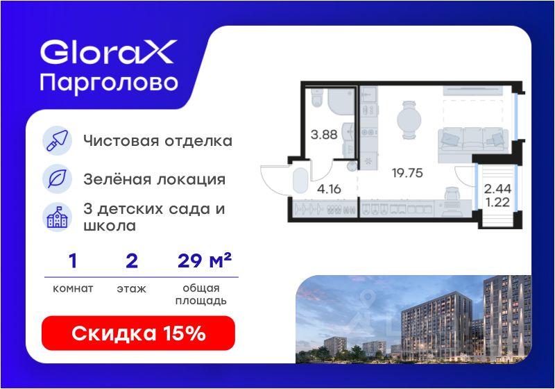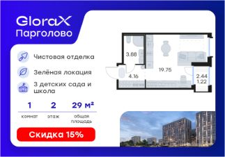 Продается квартира-студия на 2-м этаже в проекте комфорт-класса GloraX Парголово. Общая площадь лота составляет 29,01 кв. м, из которых 19,75 кв. м отведено под жилую и кв. м под кухонную зону. Номер квартиры - 11.