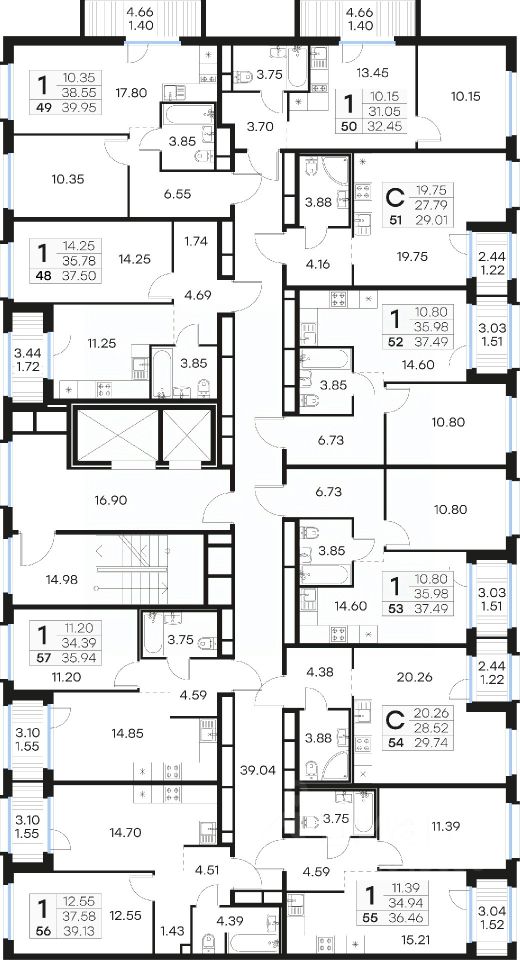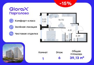 Продается 1-комн. квартира на 6-м этаже в проекте комфорт-класса GloraX Парголово. Общая площадь лота составляет 39,13 кв. м, из которых 12,55 кв. м отведено под жилую и 14,70 кв. м под кухонную зону. Номер квартиры - 56.