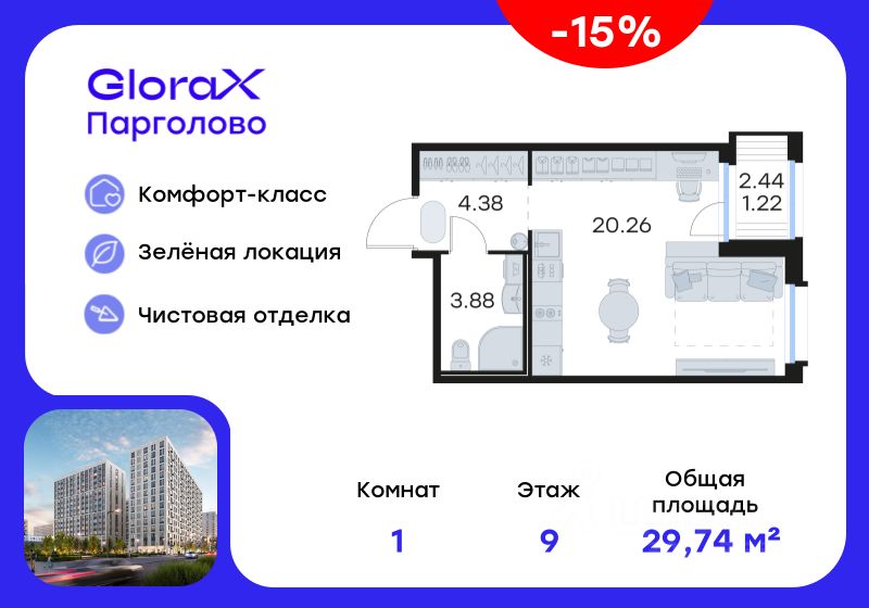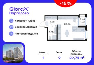 Продается квартира-студия на 9-м этаже в проекте комфорт-класса GloraX Парголово. Общая площадь лота составляет 29,74 кв. м, из которых 20,26 кв. м отведено под жилую и кв. м под кухонную зону. Номер квартиры - 84.