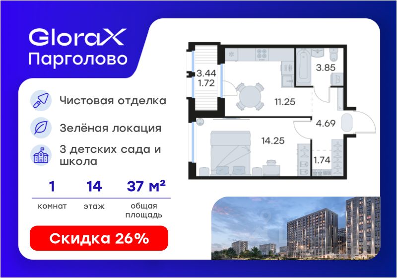 Продается 1-комн. квартира на 14-м этаже в проекте комфорт-класса GloraX Парголово. Общая площадь лота составляет 37,50 кв. м, из которых 14,25 кв. м отведено под жилую и 11,25 кв. м под кухонную зону. Номер квартиры - 281.