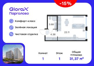Продается квартира-студия на 1-м этаже в проекте комфорт-класса GloraX Парголово. Общая площадь лота составляет 31,37 кв. м, из которых 23,11 кв. м отведено под жилую и кв. м под кухонную зону. Номер квартиры - 151.