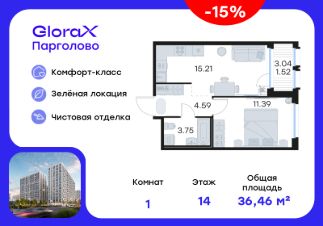 Продается 1-комн. квартира на 14-м этаже в проекте комфорт-класса GloraX Парголово. Общая площадь лота составляет 36,46 кв. м, из которых 11,39 кв. м отведено под жилую и 15,21 кв. м под кухонную зону. Номер квартиры - 274.
