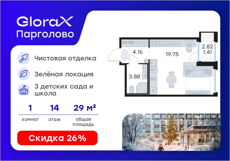 Продается квартира-студия на 14-м этаже в проекте комфорт-класса GloraX Парголово. Общая площадь лота составляет 29,20 кв. м, из которых 19,75 кв. м отведено под жилую и кв. м под кухонную зону. Номер квартиры - 278.
