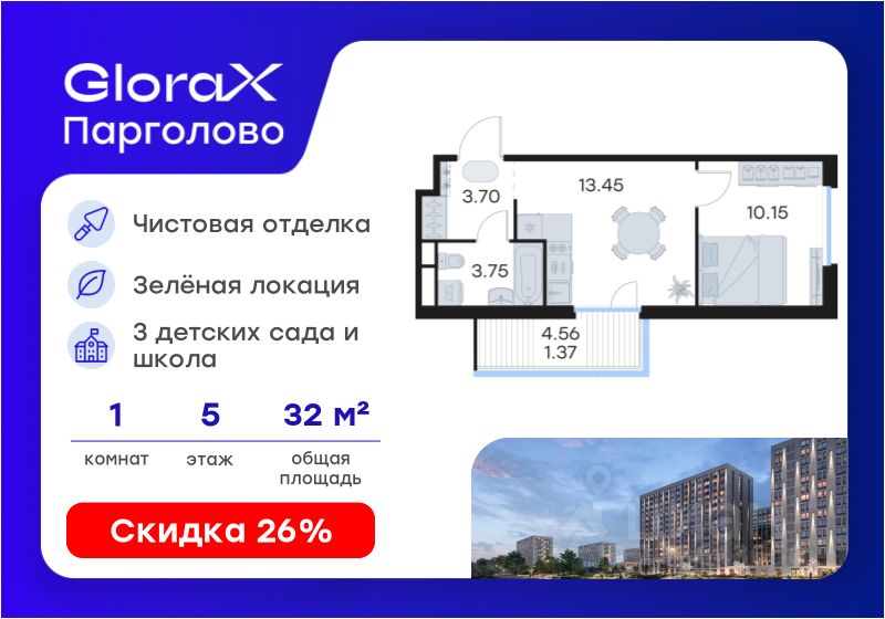Продается 1-комн. квартира на 5-м этаже в проекте комфорт-класса GloraX Парголово. Общая площадь лота составляет 32,42 кв. м, из которых 10,15 кв. м отведено под жилую и 13,45 кв. м под кухонную зону. Номер квартиры - 189.