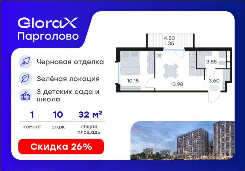 Продается 1-комн. квартира на 10-м этаже в проекте комфорт-класса GloraX Парголово. Общая площадь лота составляет 32,93 кв. м, из которых 10,15 кв. м отведено под жилую и 13,98 кв. м под кухонную зону. Номер квартиры - 94.