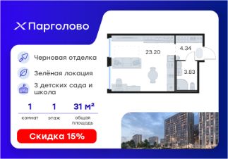 Продается квартира-студия на 1-м этаже в проекте комфорт-класса Парголово. Общая площадь лота составляет 31,37 кв. м, из которых 23,20 кв. м отведено под жилую и кв. м под кухонную зону. Номер квартиры - 4.