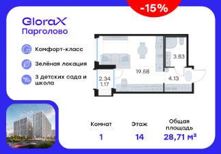 Продается квартира-студия на 14-м этаже в проекте комфорт-класса GloraX Парголово. Общая площадь лота составляет 28,71 кв. м, из которых 19,58 кв. м отведено под жилую и кв. м под кухонную зону. Номер квартиры - 133.