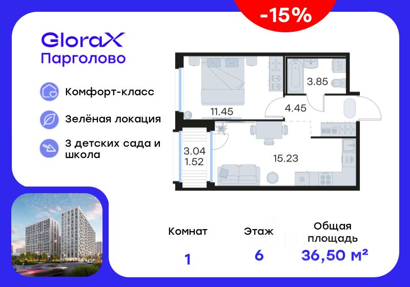Продается 1-комн. квартира на 6-м этаже в проекте комфорт-класса GloraX Парголово. Общая площадь лота составляет 36,50 кв. м, из которых 11,45 кв. м отведено под жилую и 15,23 кв. м под кухонную зону. Номер квартиры - 49.