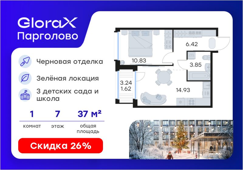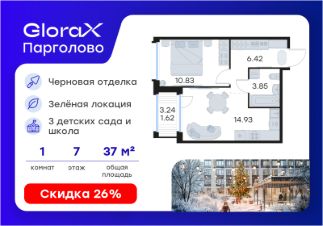Продается 1-комн. квартира на 7-м этаже в проекте комфорт-класса GloraX Парголово. Общая площадь лота составляет 37,65 кв. м, из которых 10,83 кв. м отведено под жилую и 14,93 кв. м под кухонную зону. Номер квартиры - 61.
