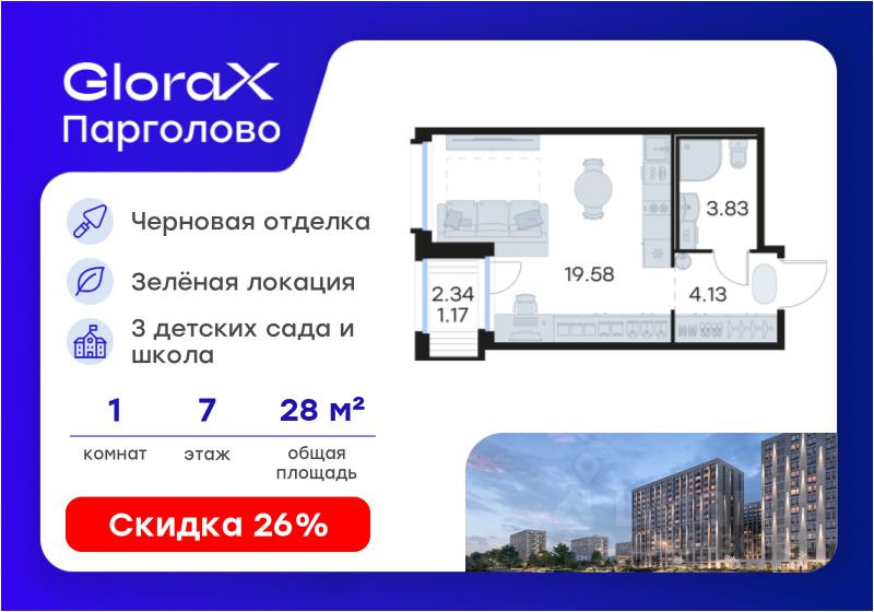 Продается квартира-студия на 7-м этаже в проекте комфорт-класса GloraX Парголово. Общая площадь лота составляет 28,71 кв. м, из которых 19,58 кв. м отведено под жилую и кв. м под кухонную зону. Номер квартиры - 63.