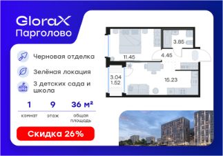 Продается 1-комн. квартира на 9-м этаже в проекте комфорт-класса GloraX Парголово. Общая площадь лота составляет 36,50 кв. м, из которых 11,45 кв. м отведено под жилую и 15,23 кв. м под кухонную зону. Номер квартиры - 79.