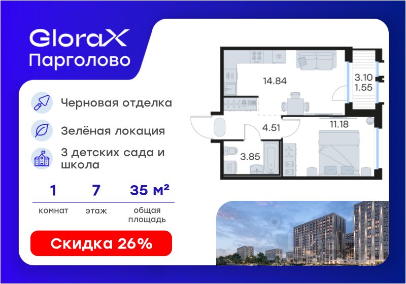 Продается 1-комн. квартира на 7-м этаже в проекте комфорт-класса GloraX Парголово. Общая площадь лота составляет 35,93 кв. м, из которых 11,18 кв. м отведено под жилую и 14,84 кв. м под кухонную зону. Номер квартиры - 204.