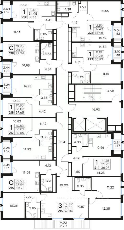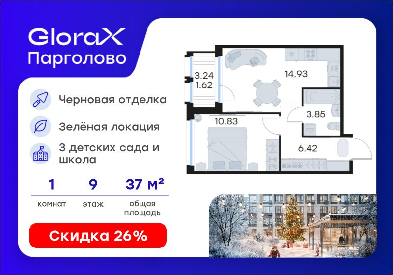 Продается 1-комн. квартира на 9-м этаже в проекте комфорт-класса GloraX Парголово. Общая площадь лота составляет 37,65 кв. м, из которых 10,83 кв. м отведено под жилую и 14,93 кв. м под кухонную зону. Номер квартиры - 218.