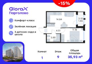 Продается 1-комн. квартира на 9-м этаже в проекте комфорт-класса GloraX Парголово. Общая площадь лота составляет 35,93 кв. м, из которых 11,18 кв. м отведено под жилую и 14,84 кв. м под кухонную зону. Номер квартиры - 222.