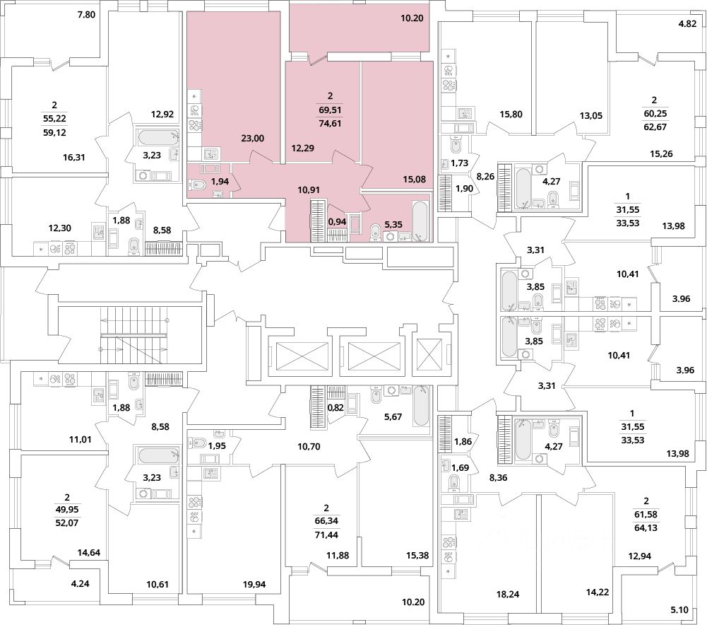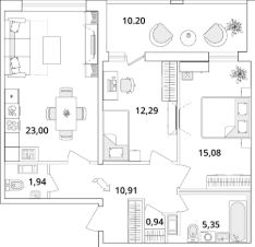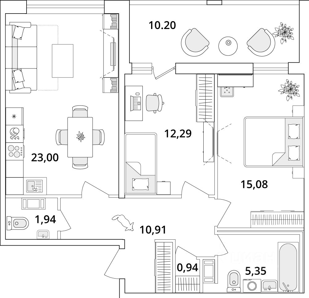 Квартира находится в 18 этажном доме, в Корпус 5-Cube на 12 этаже. Общая площадь квартиры 74,90 кв.м.