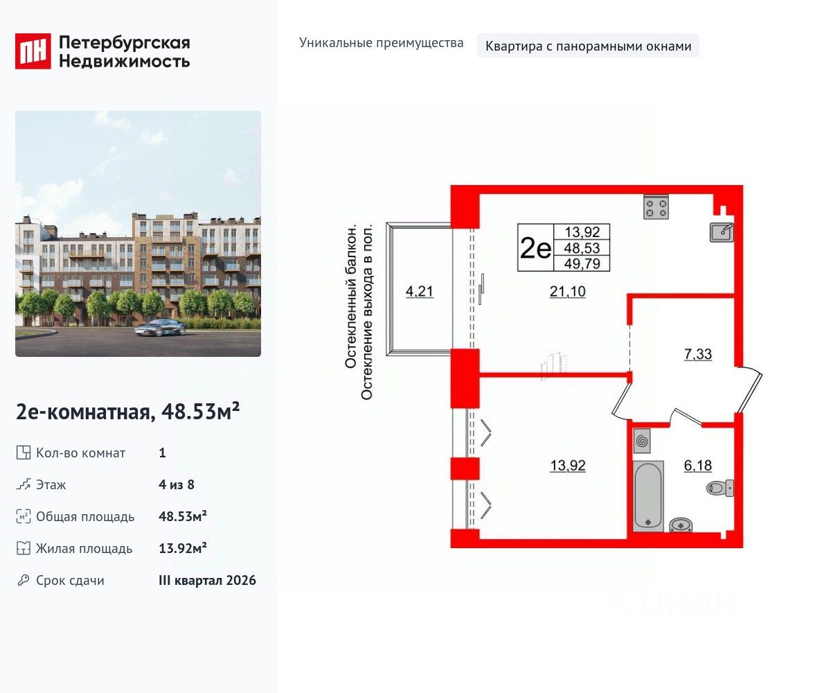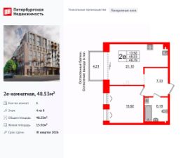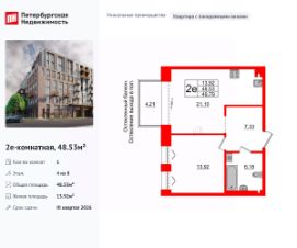 Уникальная, функциональная европланировка, большая кухня-гостиная 21.1 м², просторная прихожая 7.33 м². Общая площадь квартиры - 48.53 м², жилая 13.92 м², высота потолка 3 м.