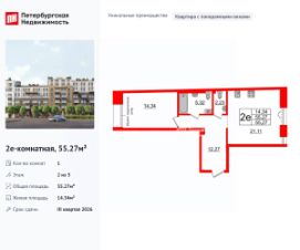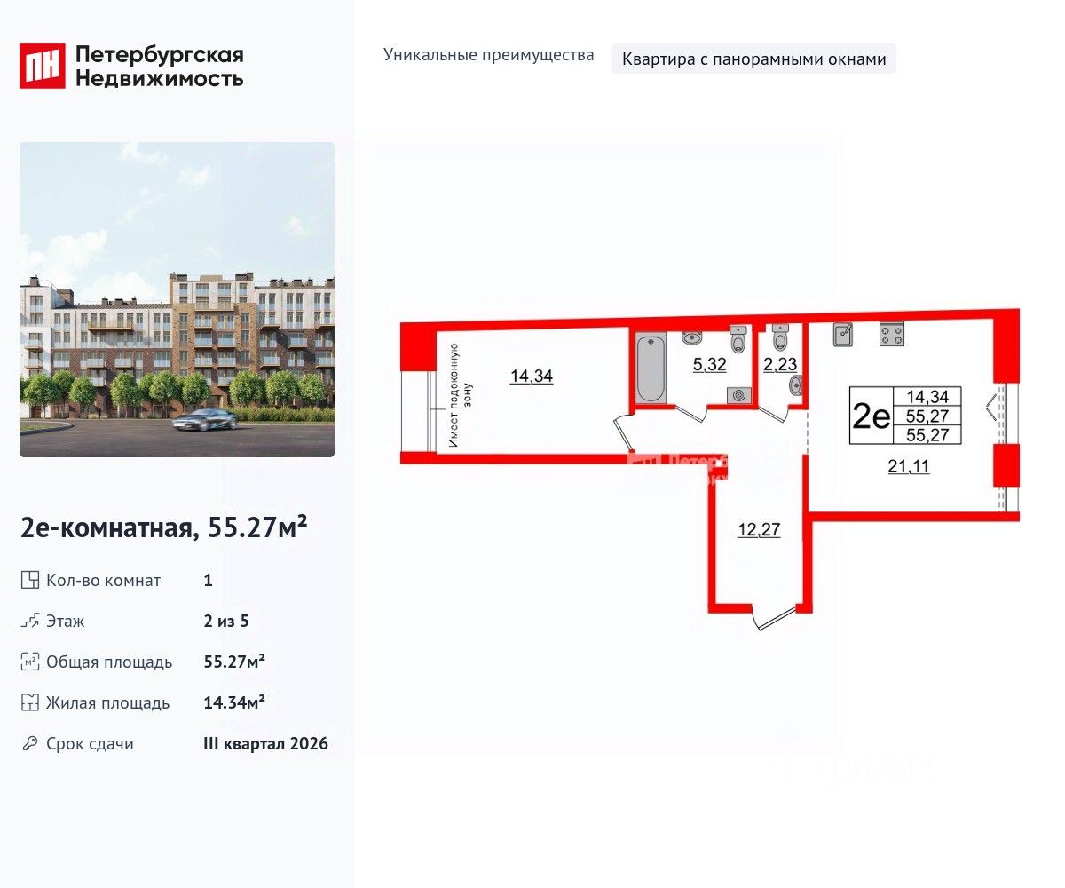 Уникальная, функциональная европланировка, большая кухня-гостиная 21.11 м², просторная прихожая 12.27 м². Общая площадь квартиры - 55.27 м², жилая 14.34 м², высота потолка 3 м.