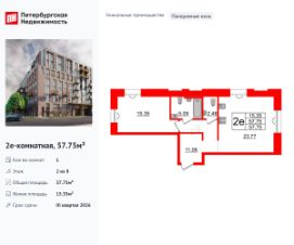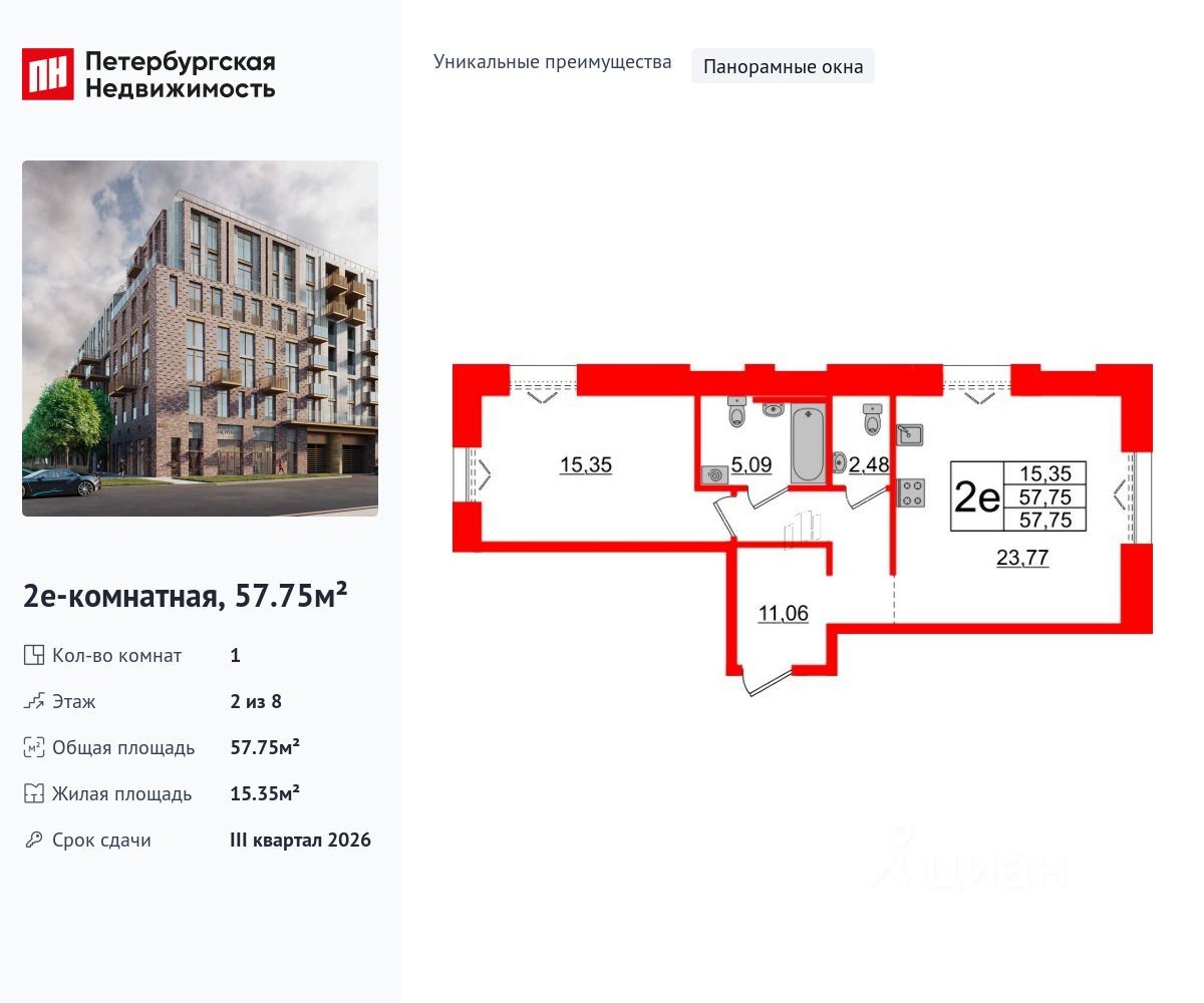 Уникальная, функциональная европланировка, большая кухня-гостиная 23.77 м², просторная прихожая 11.06 м². Общая площадь квартиры - 57.75 м², жилая 15.35 м², высота потолка 3 м.