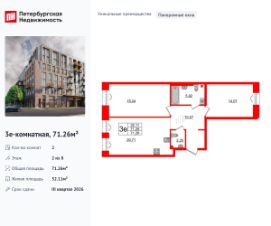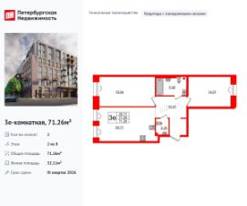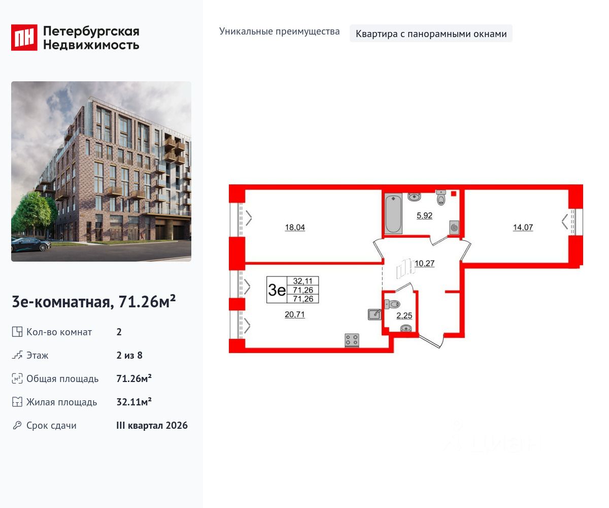 Уникальная, функциональная европланировка, большая кухня-гостиная 20.71 м², просторная прихожая 10.27 м². Общая площадь квартиры - 71.26 м², жилая 32.11 м², высота потолка 3 м.