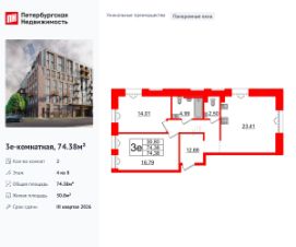 Уникальная, функциональная европланировка, большая кухня-гостиная 23.41 м², просторная прихожая 12.68 м². Общая площадь квартиры - 74.38 м², жилая 30.8 м², высота потолка 3 м.