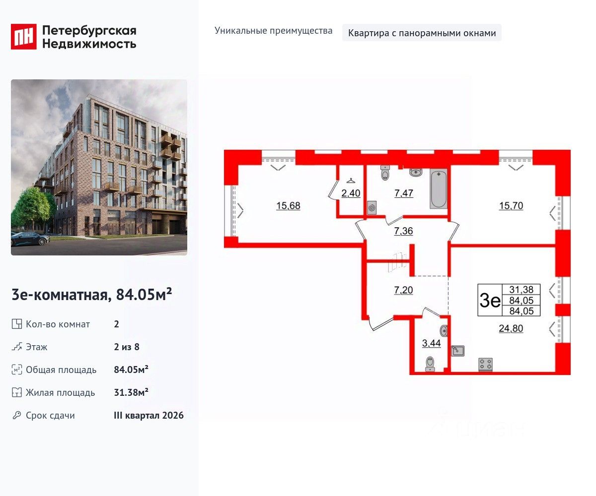 Уникальная, функциональная европланировка, большая кухня-гостиная 24.8 м², вместительная прихожая 7.2 м². Общая площадь квартиры - 84.05 м², жилая 31.38 м², высота потолка 3 м.
