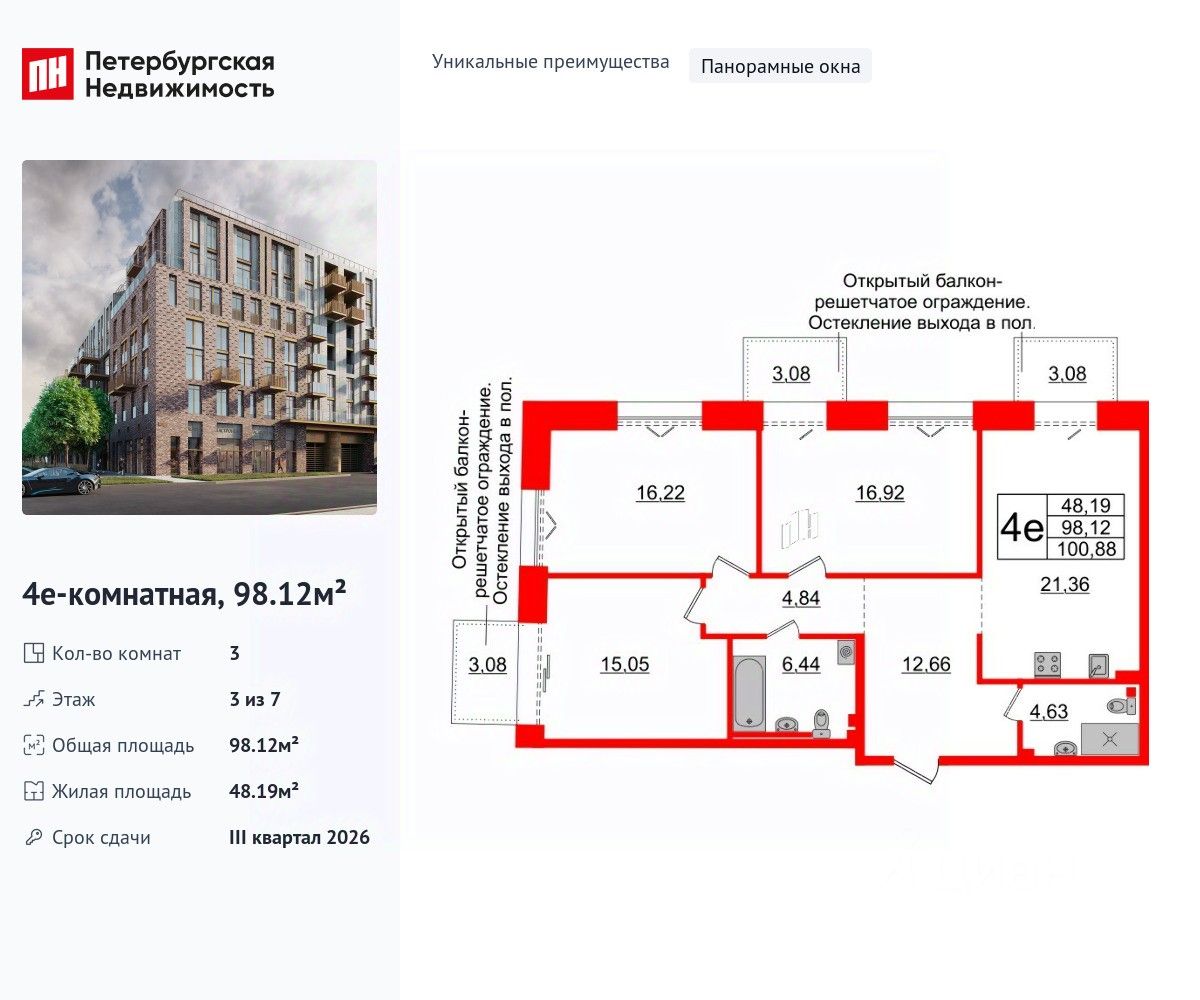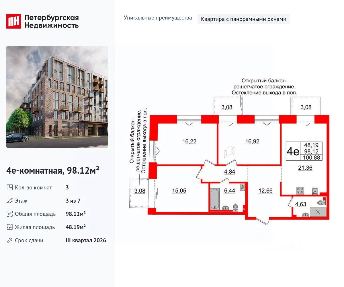 Уникальная, функциональная европланировка, большая кухня-гостиная 21.36 м², просторная прихожая 12.66 м². Общая площадь квартиры - 98.12 м², жилая 48.19 м², высота потолка 3 м.