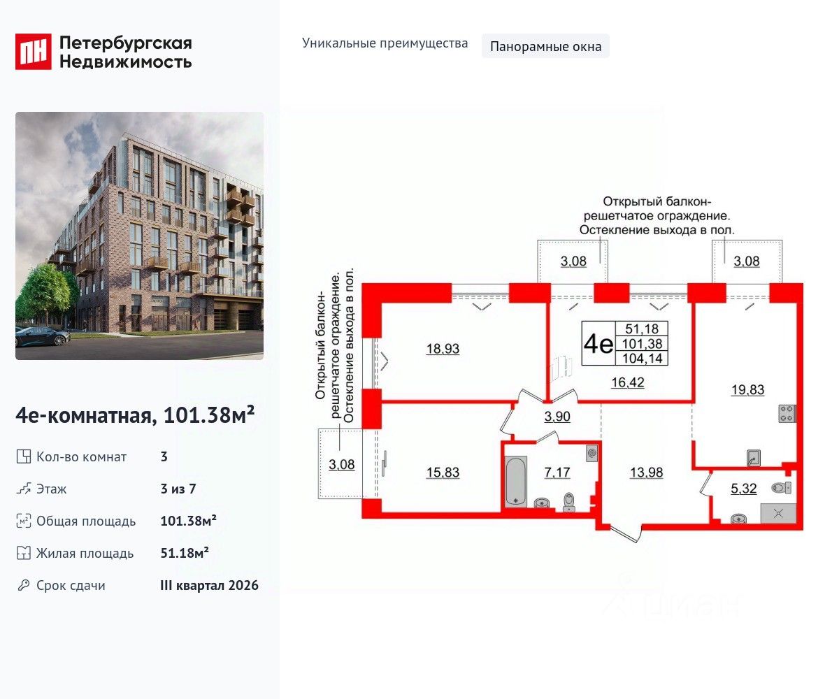 Уникальная, функциональная европланировка, большая кухня-гостиная 19.83 м², просторная прихожая 13.98 м². Общая площадь квартиры - 101.38 м², жилая 51.18 м², высота потолка 3 м.