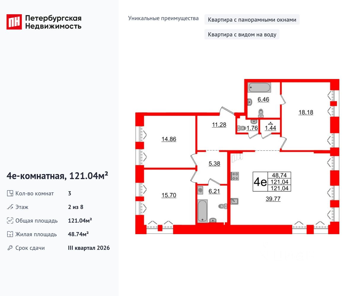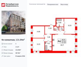 Уникальная, функциональная европланировка, большая кухня-гостиная 39.77 м², вместительная прихожая 11.28 м². Общая площадь квартиры - 121.04 м², жилая 48.74 м², высота потолка 3 м.