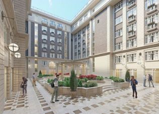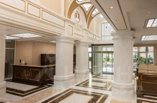 • Центральная зона рецепции с эксклюзивной отделкой мрамором и массивом дерева с круглосуточным постом охраны и консьерж-сервисом