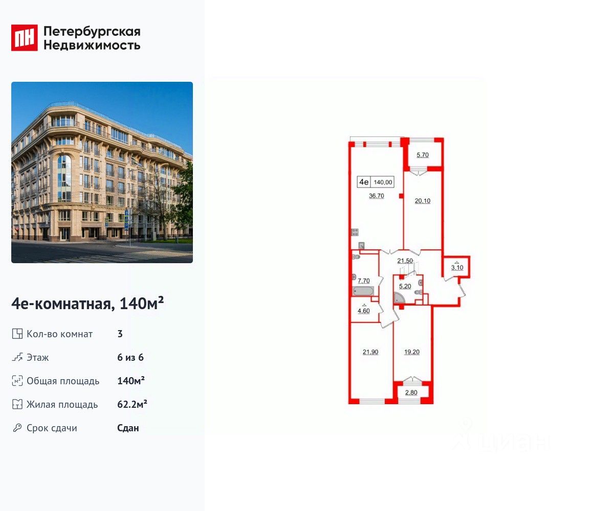 Удобная, классическая, функциональная европланировка, большая кухня-гостиная 36.7 м², просторная прихожая 21.5 м². Общая площадь квартиры - 140 м², жилая 62.2 м².